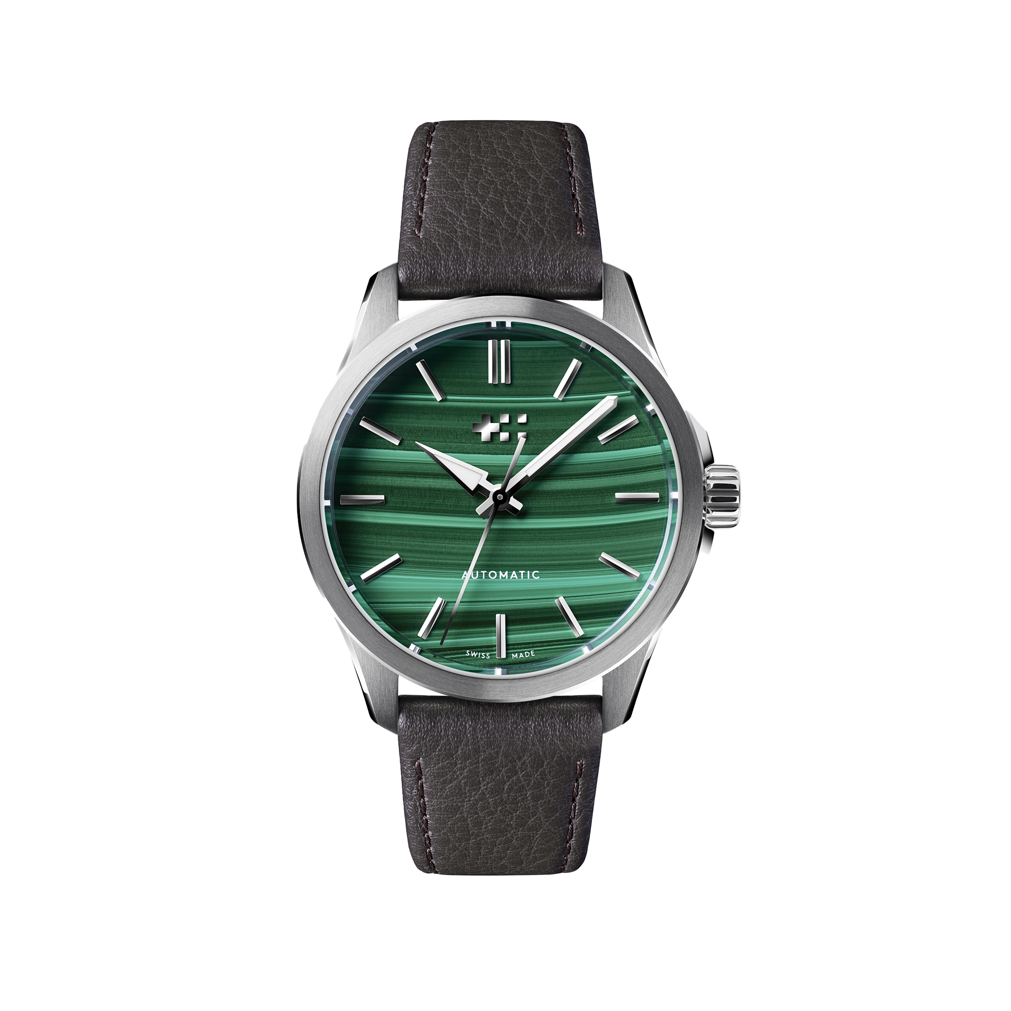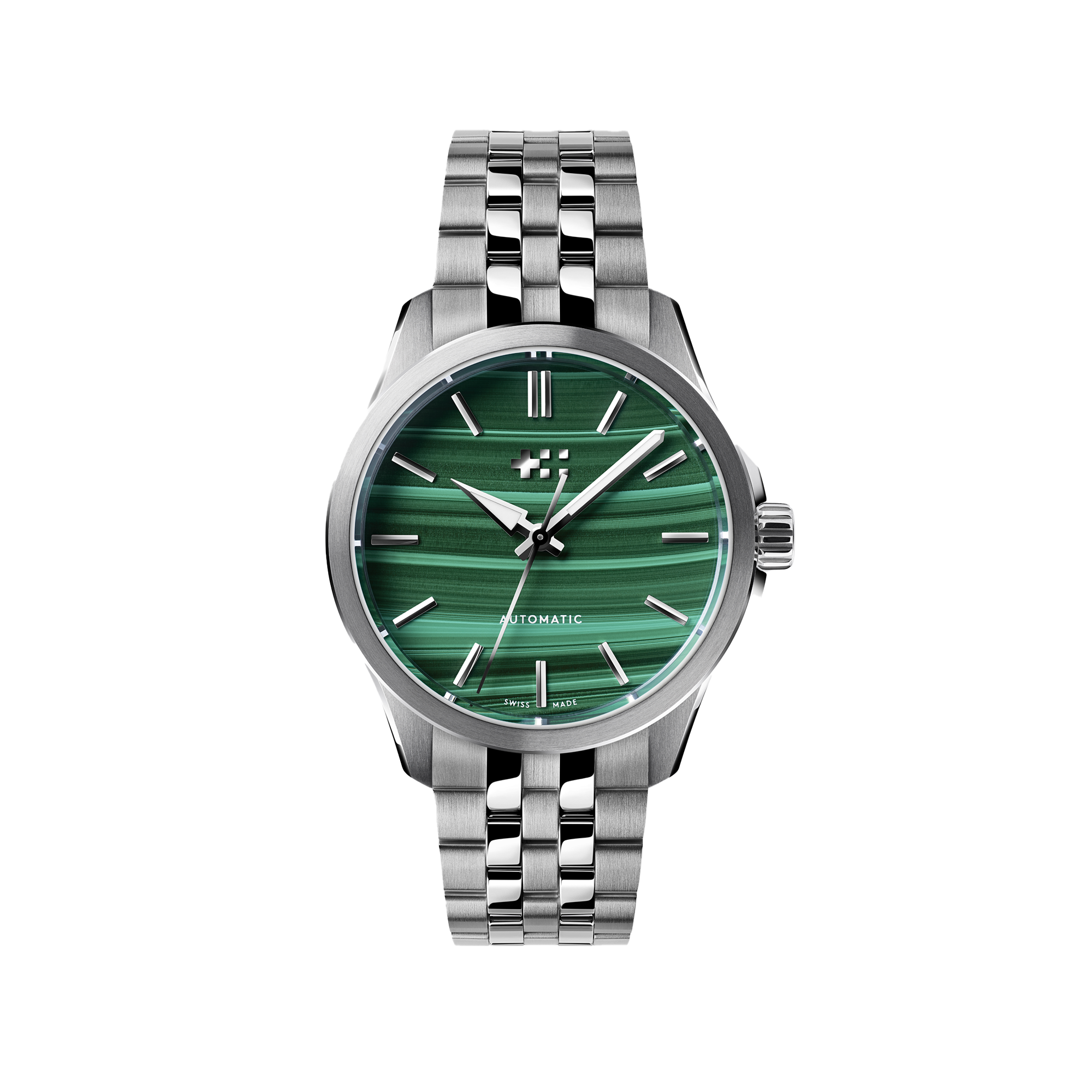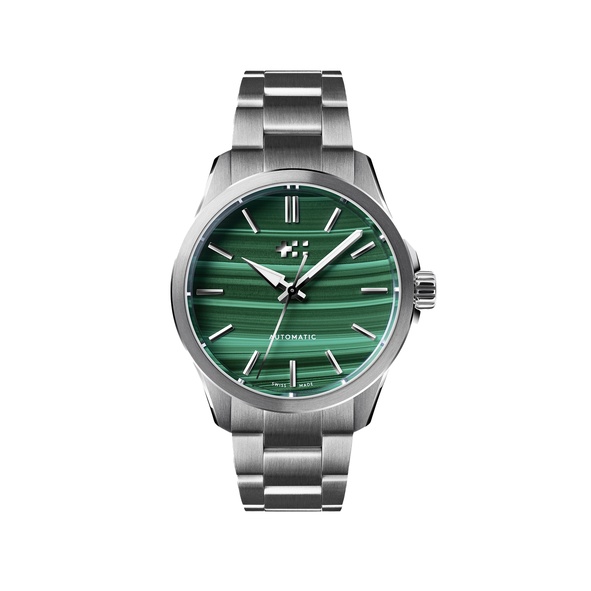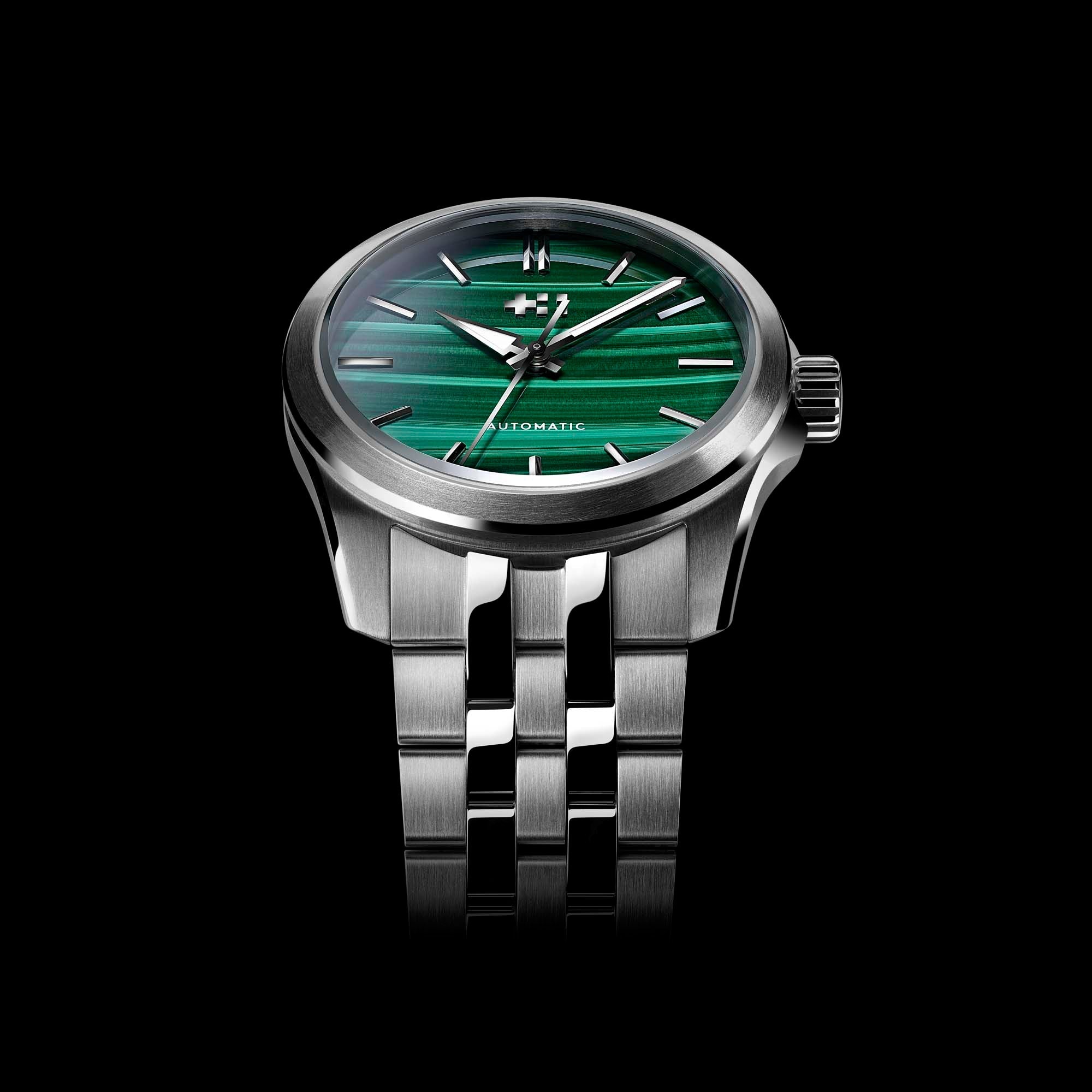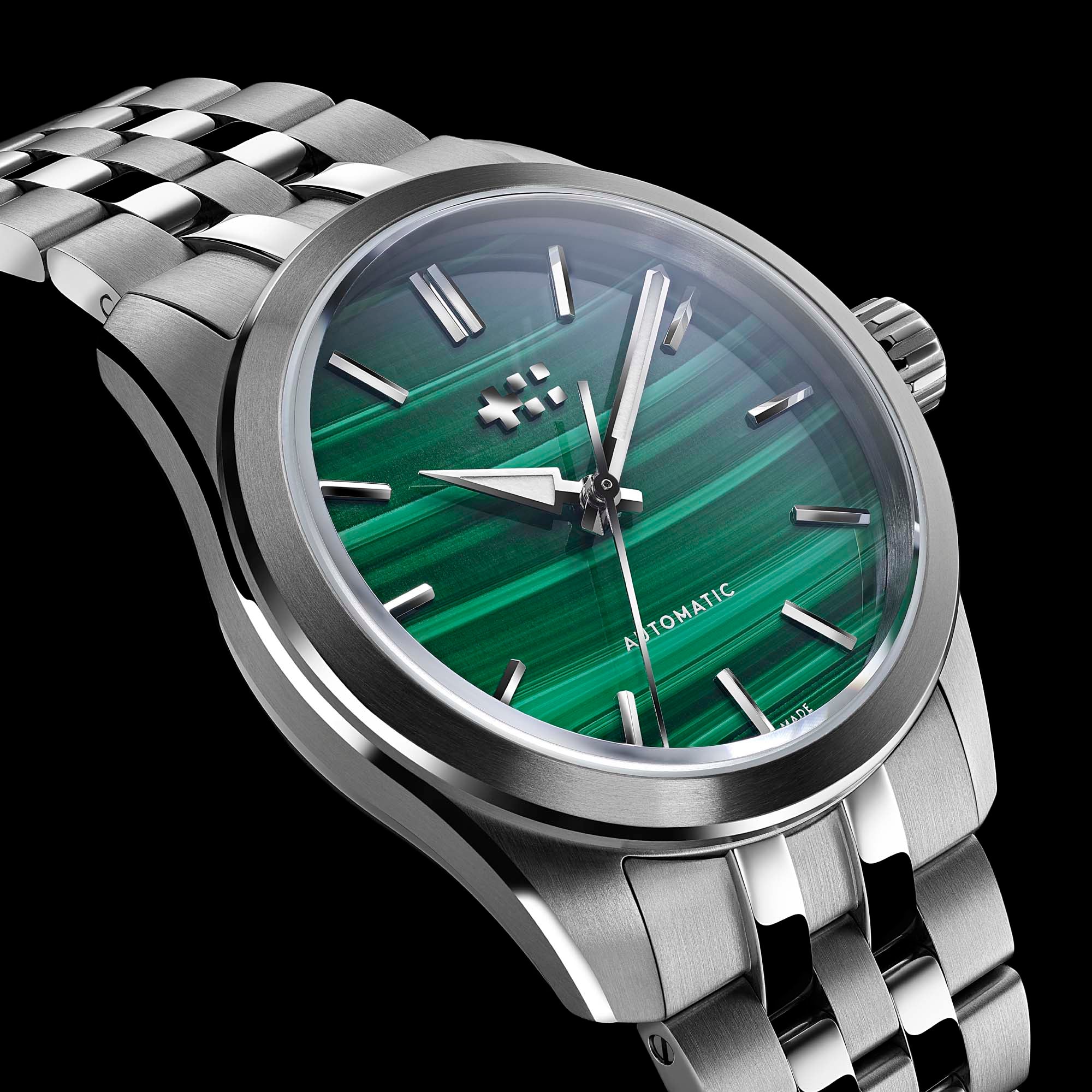 A vivid take on Christopher Ward’s refined Sealander, this 150-piece limited edition features a natural Malachite dial — rich with deep green bands and organic texture. Each dial is unique, making every watch one of a kind.