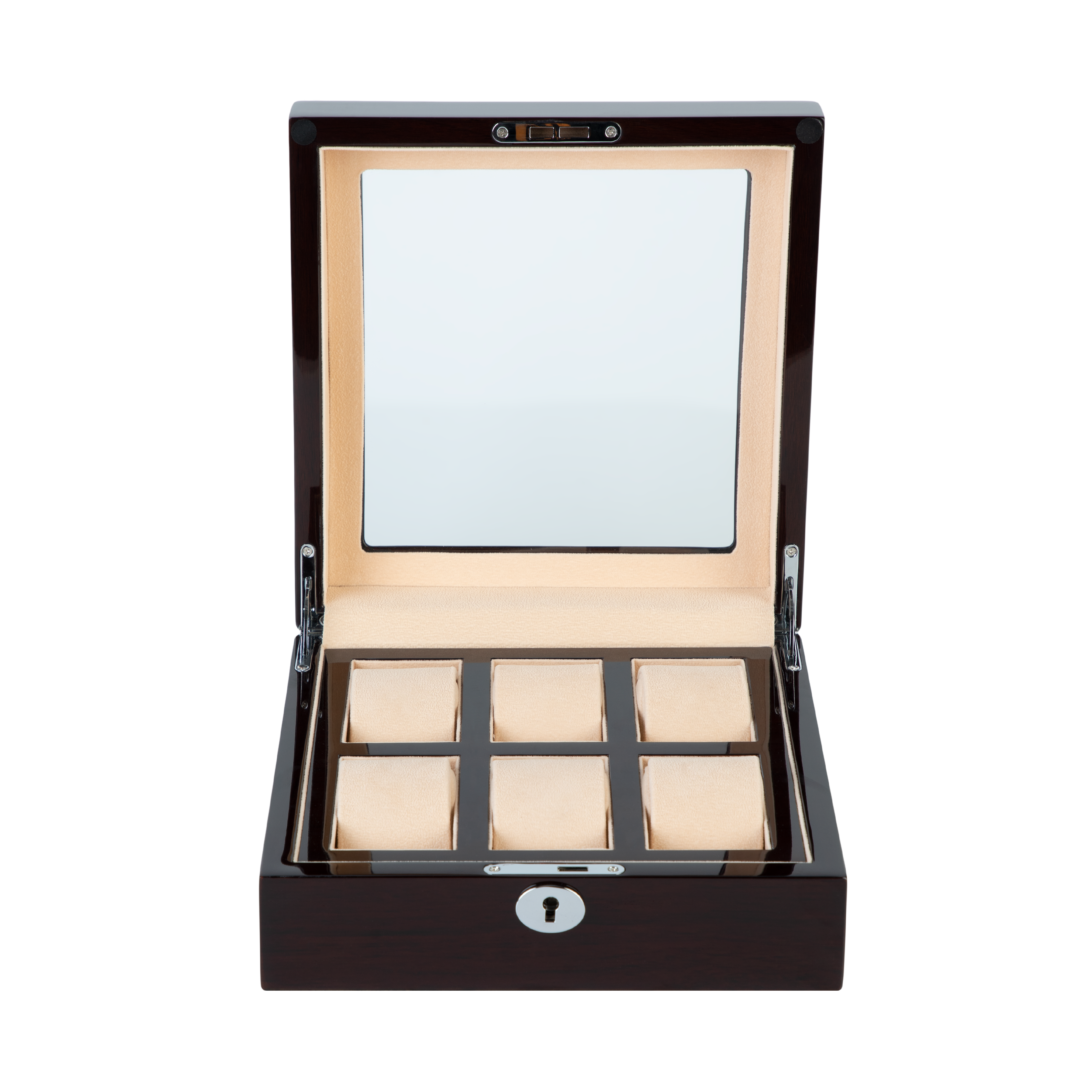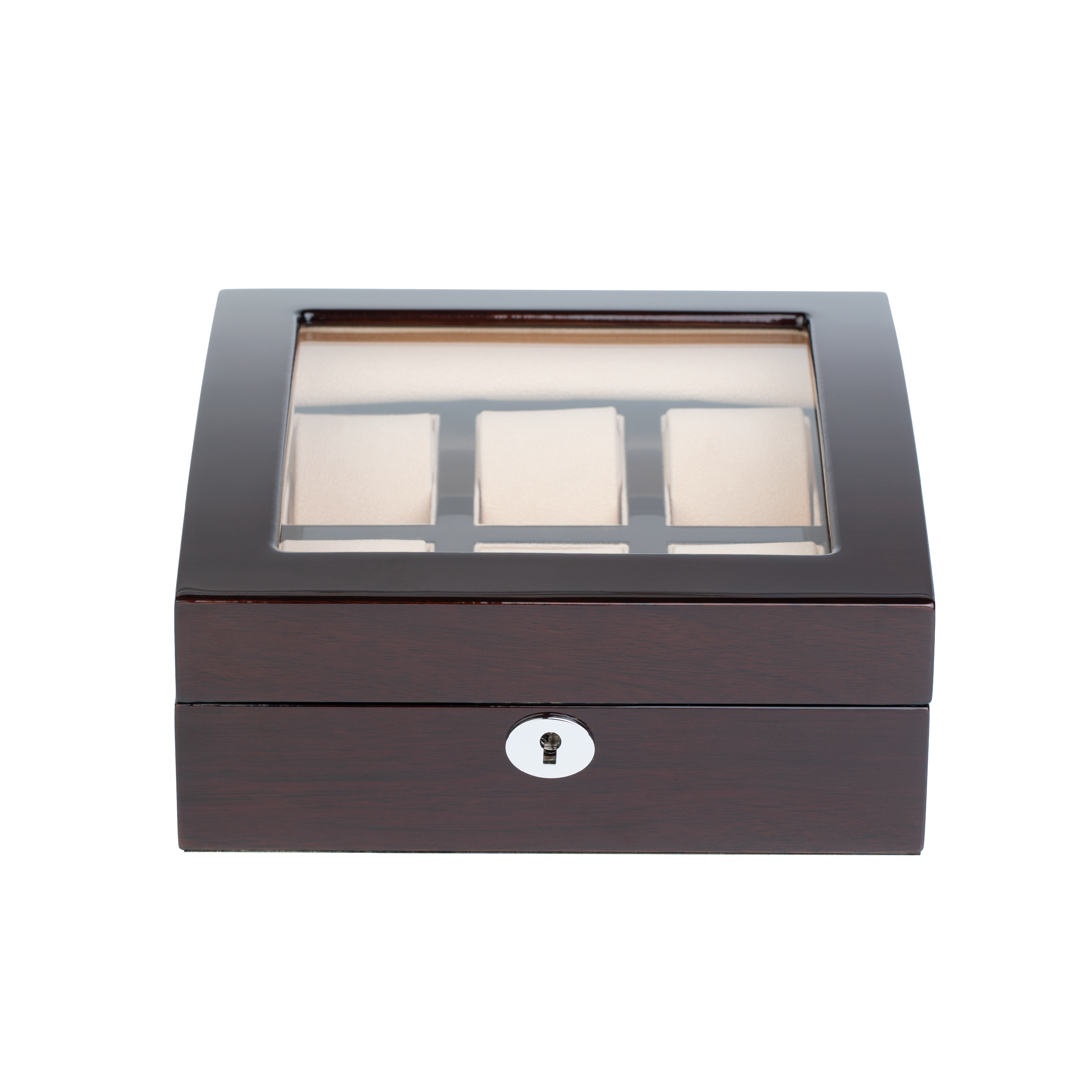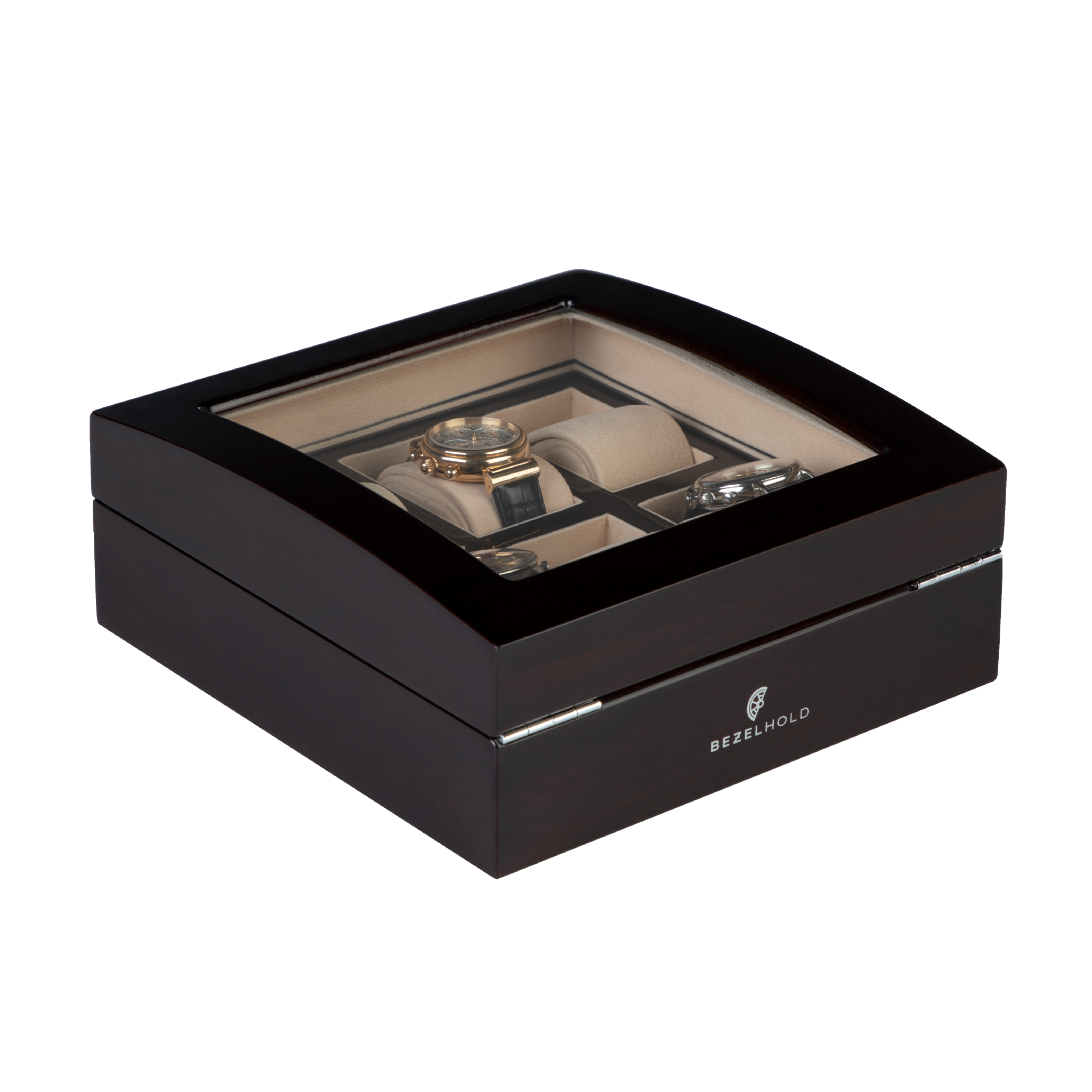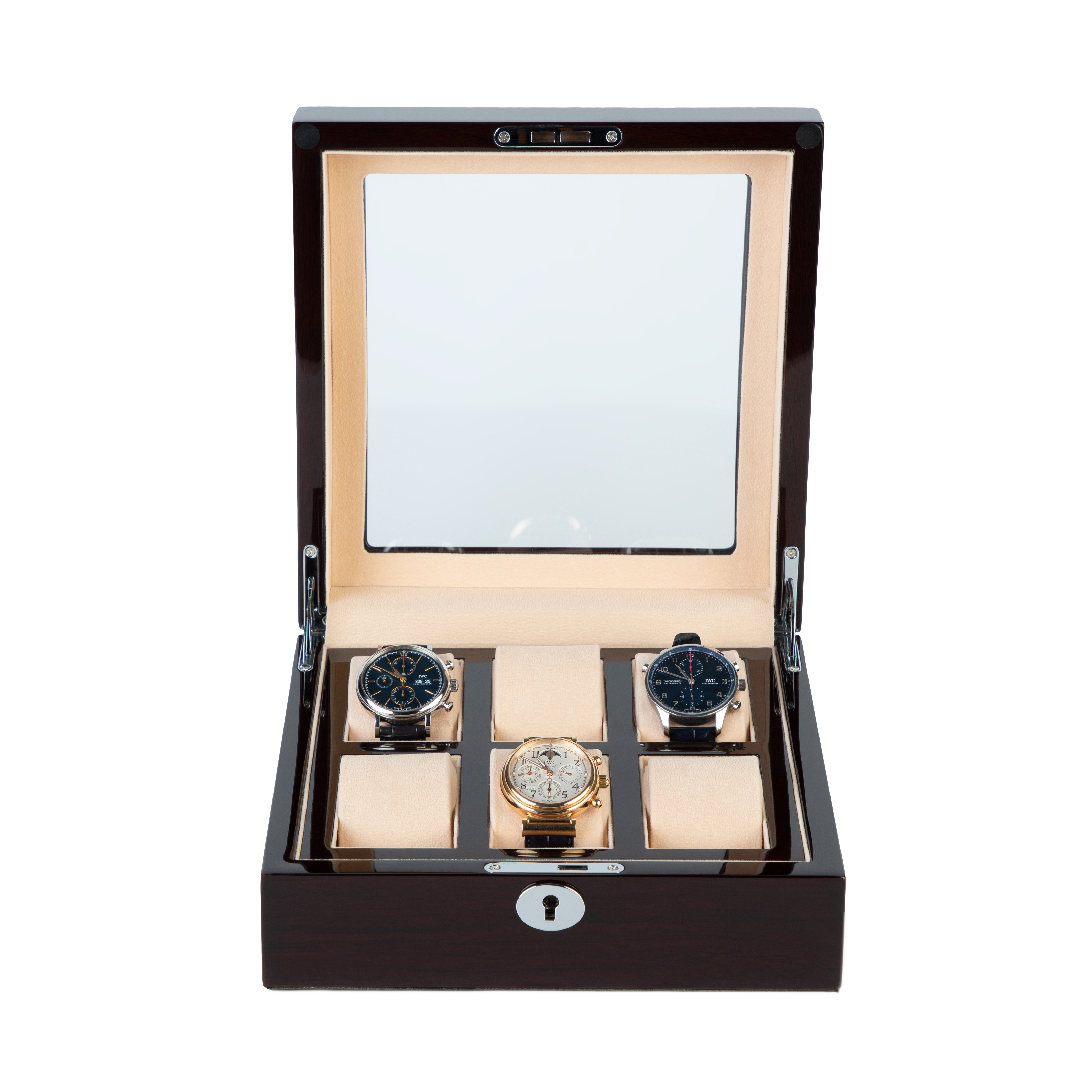 The Panorama features a curvex, tempered glass window. This allows the collector to view their watches with ease. Featuring velvet skirting and flush hinges, the Panorama has been refined with every detail in mind. Fitted with belted cushions, it offers usability across a large range of wrist sizes.