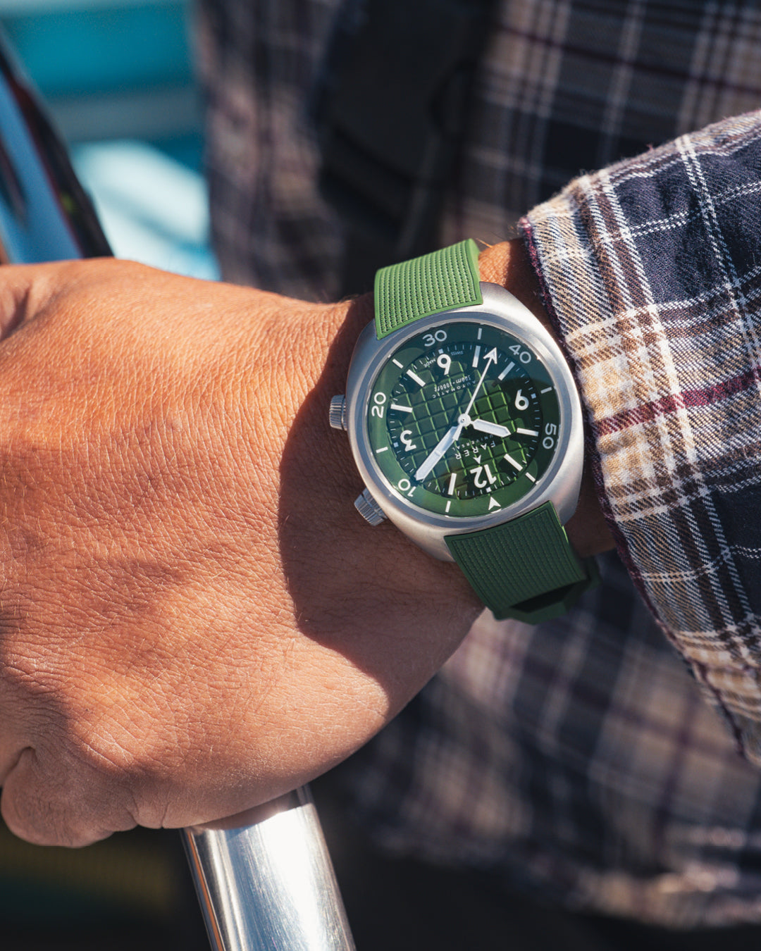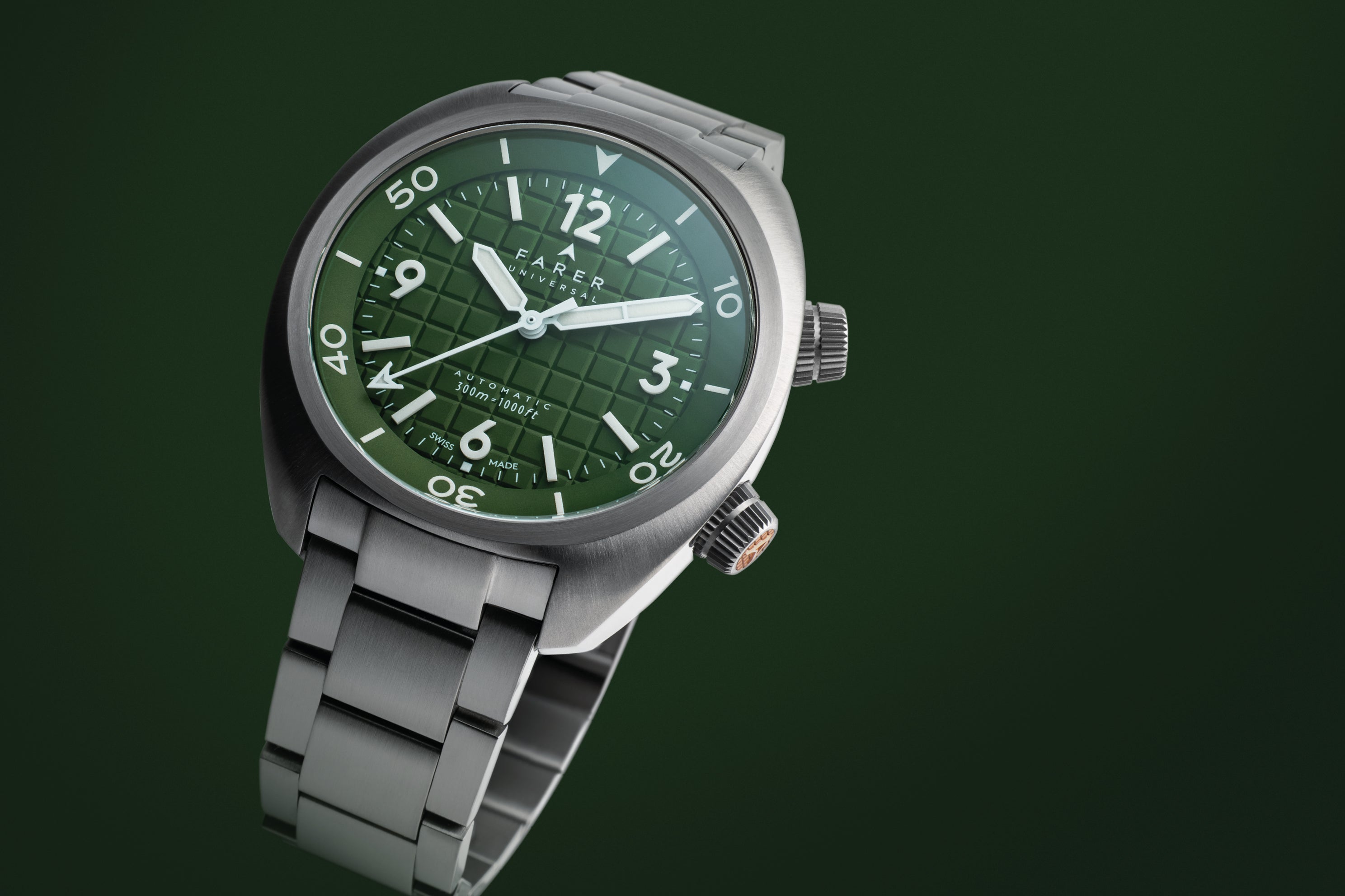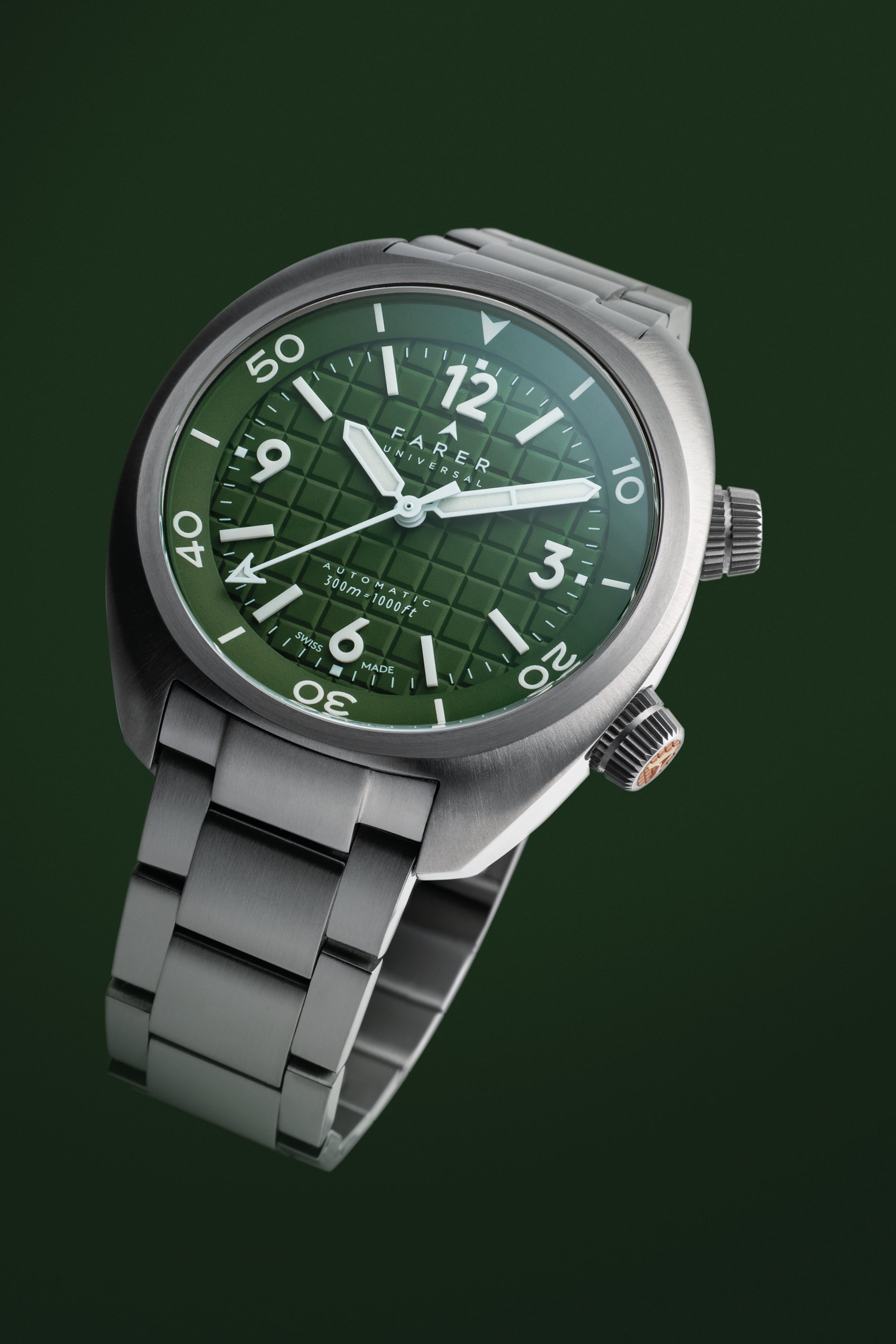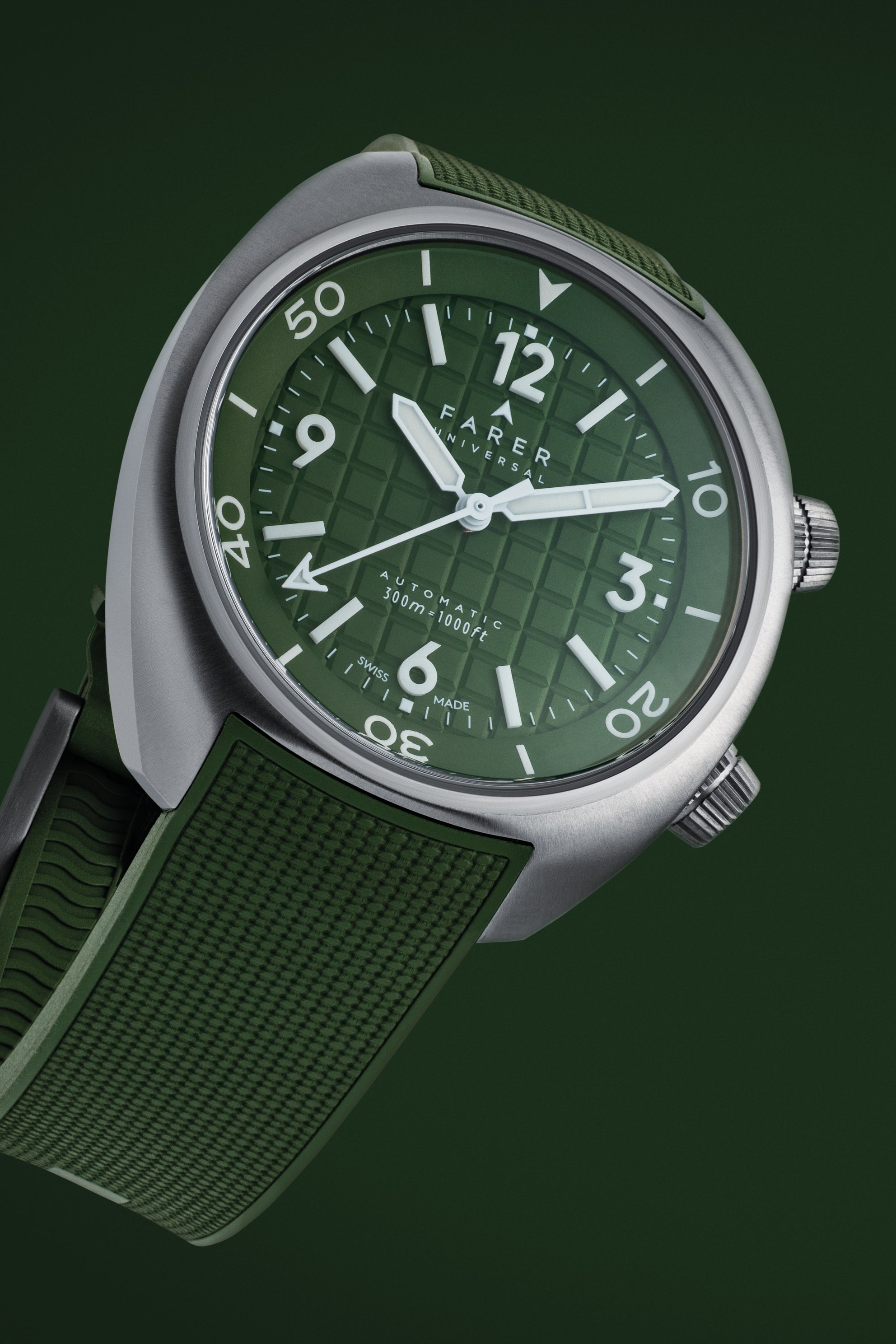 The Hecla Hunter Green is a confident mix of rich colour and practical design. Featuring a hunter green dial, stamped with a deep grid pattern, onto which are mounted pure white batons and numerals made from Lumicast, a blend of ceramic and the newest Grade X2 Super-LumiNova. These are paired with a matching white handset filled with X2 Super-LumiNova and provide excellent legibility under any lighting conditions.
