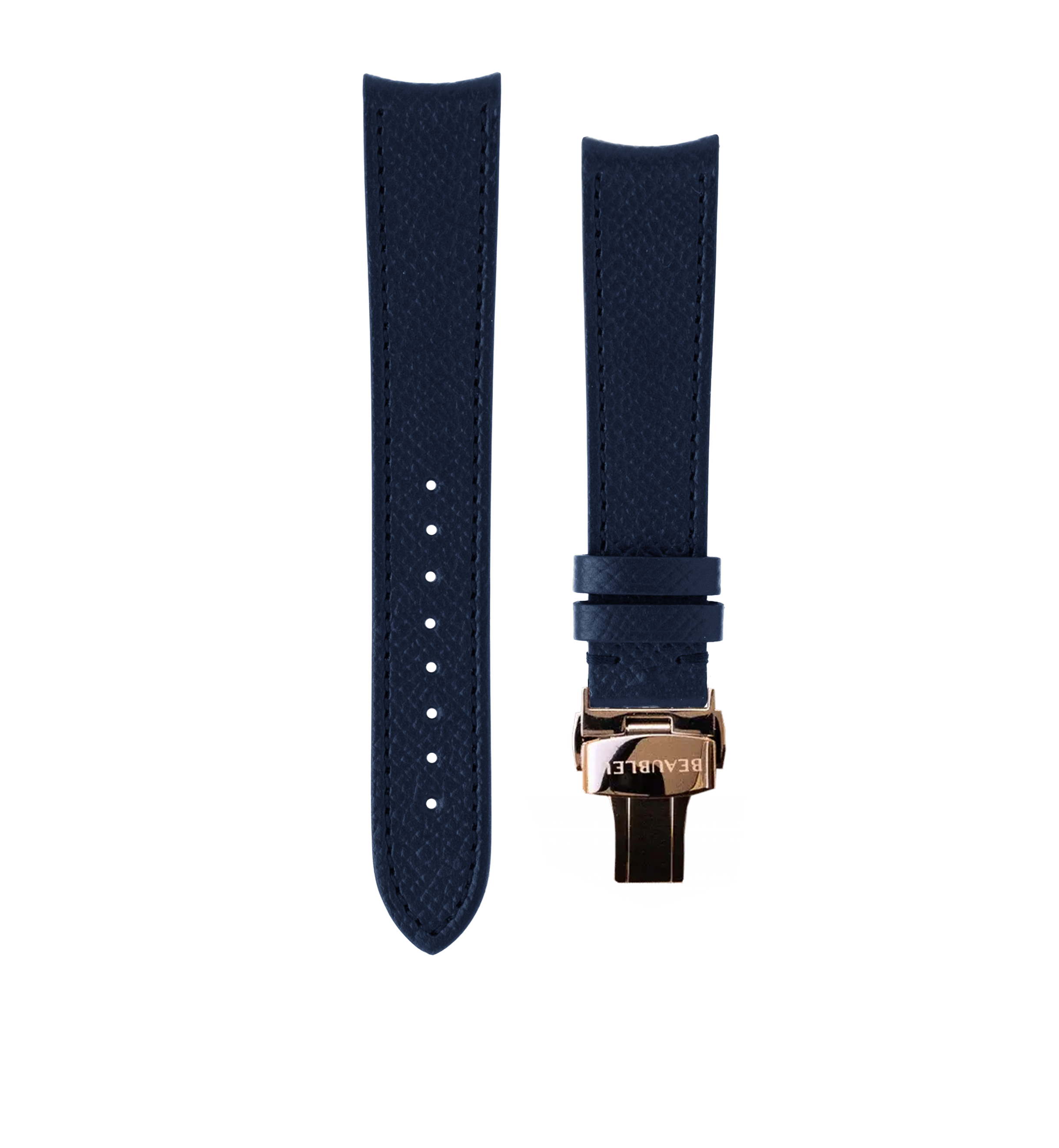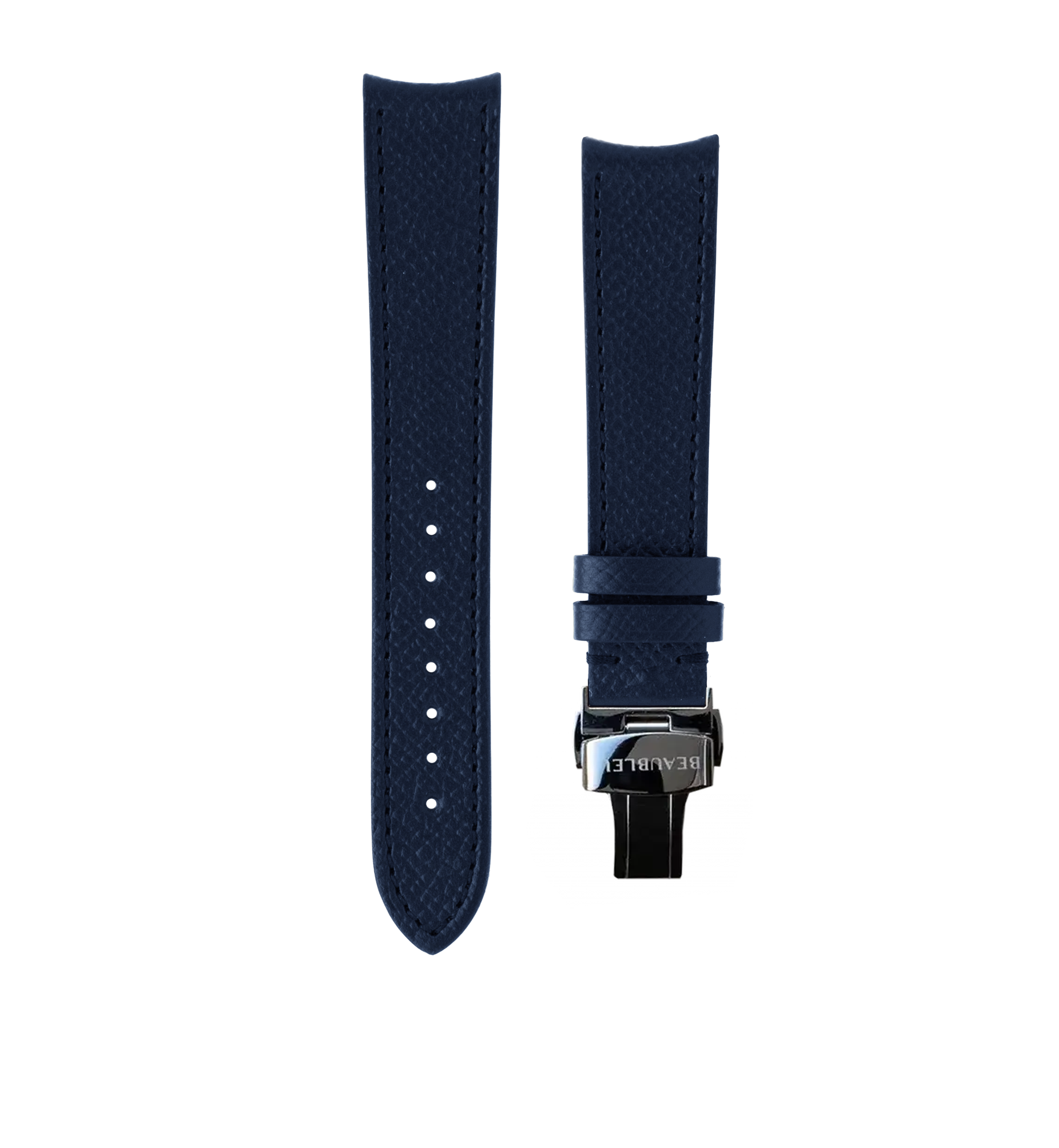 This grained blue leather strap, characterized by its refined cut and timeless allure, features a double folding buckle that combines comfort, security and elegance.