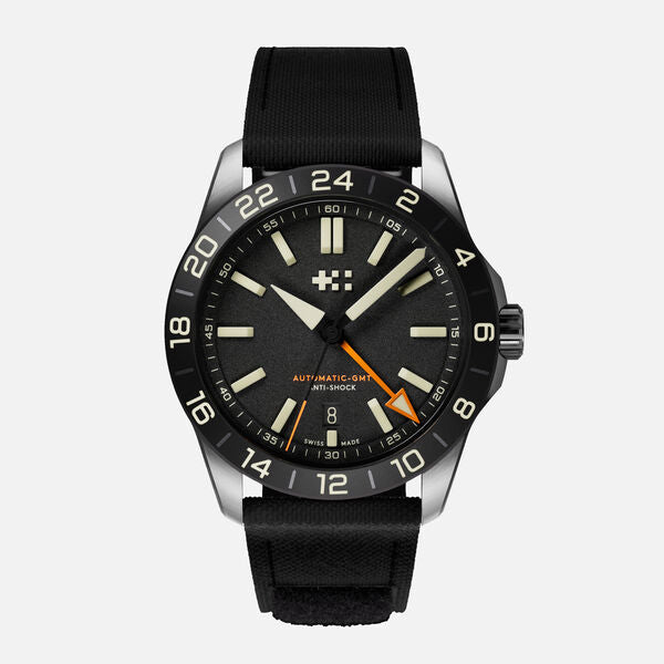 Whatever your mission, you can rely on the C63 Sealander Extreme GMT to appeal to the inner 007 in all of us. Featuring indexes and hands sculpted in Globolight® luminous ceramic that delivers high-visibility timekeeping after dark. Plus, GMT functionality courtesy of the Sellita SW330-2 movement – protected by an ingenious anti-shock system. With a textured matte dial, sandblasted ceramic bezel and a 41mm brushed steel case, the C63 Extreme GMT is the ultimate go-anywhere companion. Available on our new action-ready Cordura® V-Strap or classic Bader bracelet.