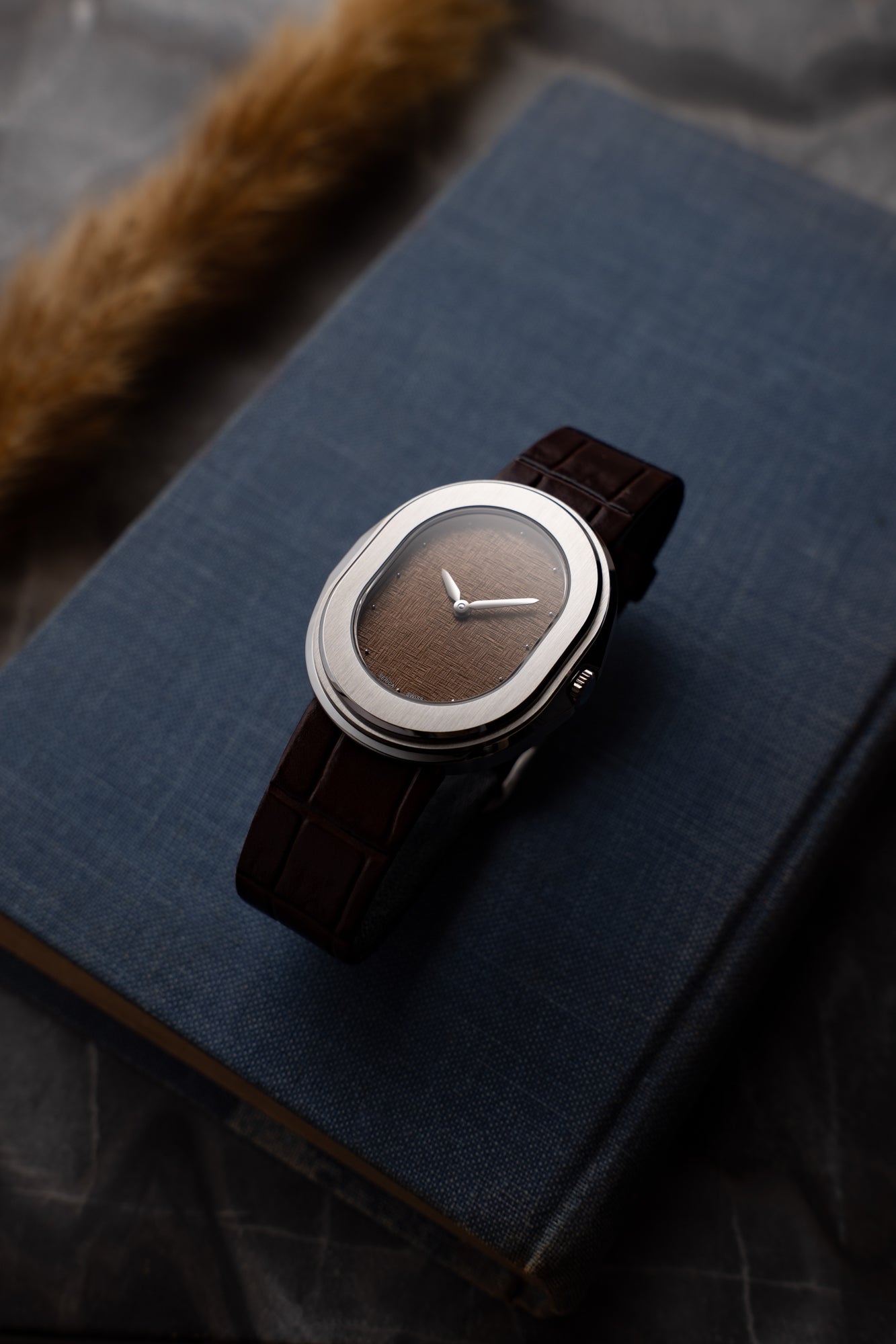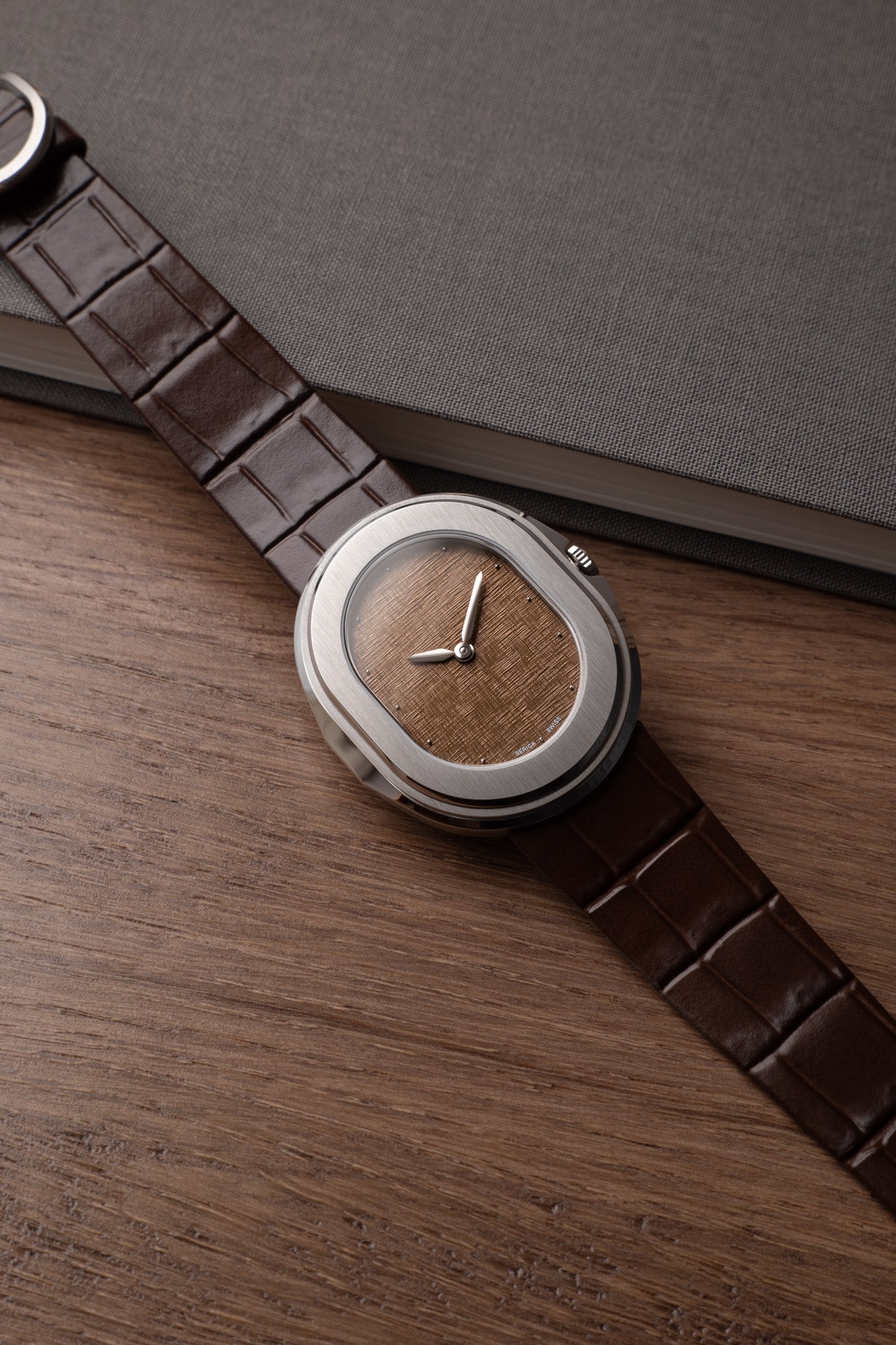 The Reference 1174 'Parade' stands out for its unique design and practical innovation. Housed in a 35mm x 41mm 316L steel case with a slim 8.3mm profile, it features a "stadium" shape—an elliptical form with straight sides—that is rarely seen in watchmaking.