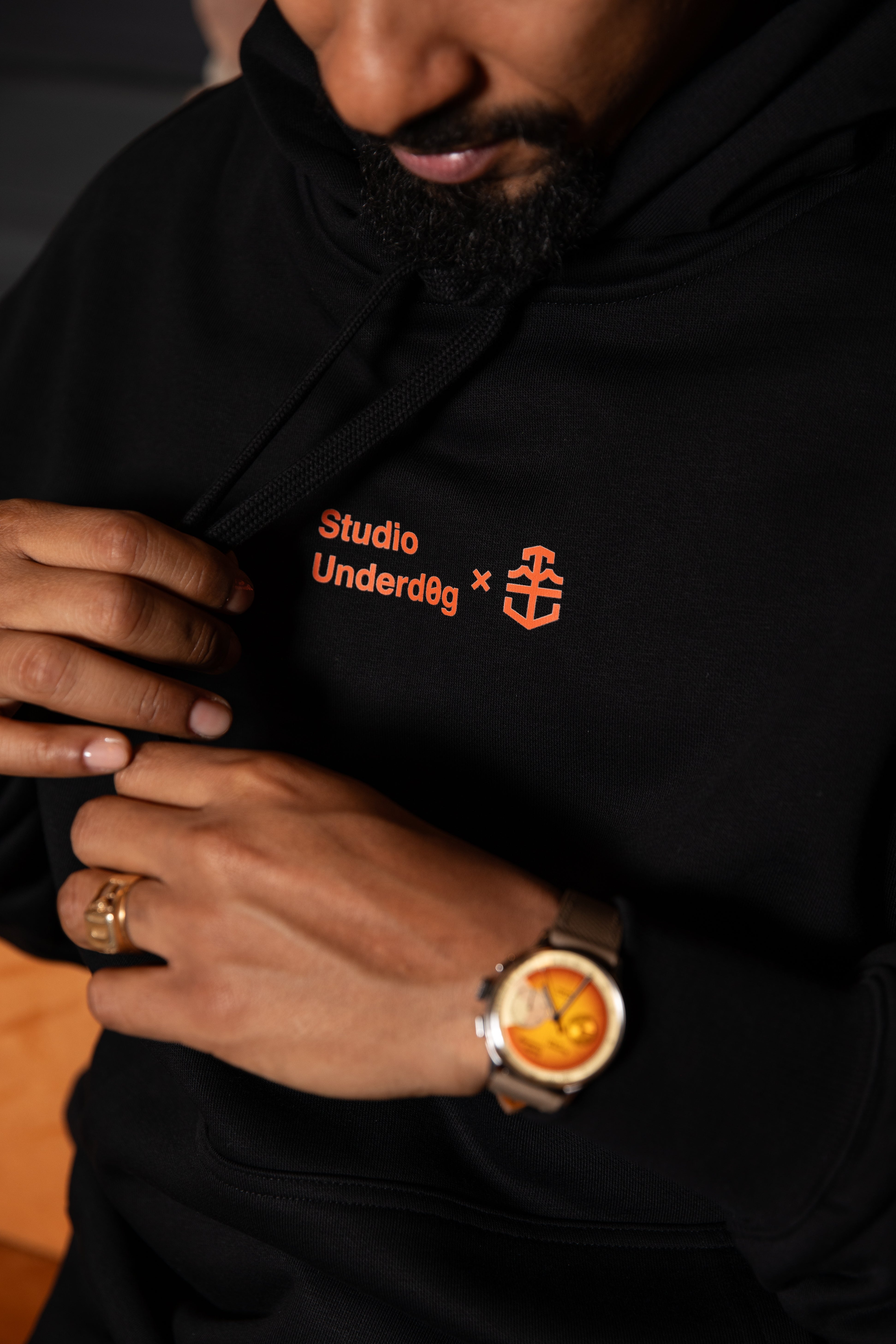 This limited-edition hoodie marks the next chapter. Released alongside the new Burnt Pepper0ni and Classic Cheese, it celebrates the moment a playful idea became a real watch, and a cult collaboration between Studio Underd0g and Time+Tide. Finished in black with bold orange detailing, it’s a wearable reminder that sometimes the best ideas emerge by accident.