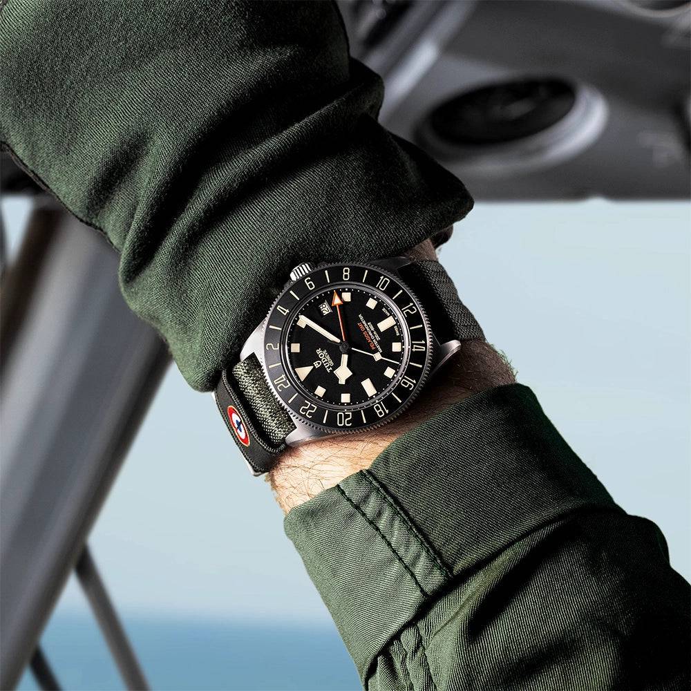 TUDOR Pelagos FXD GMT 42mm Black Dial Titanium Men's Automatic Watch M2542G257NU-0002. Titanium 42mm case and black ceramic GMT bezel all on a green fabric strap. This men's watch has a black dial with luminous applied hands and hour markers, date display at the 3 o'clock position, red GMT hand. Sapphire crystal glass and water resistant up to 200m. Power reserve up to 65 hours. Automatic movement.