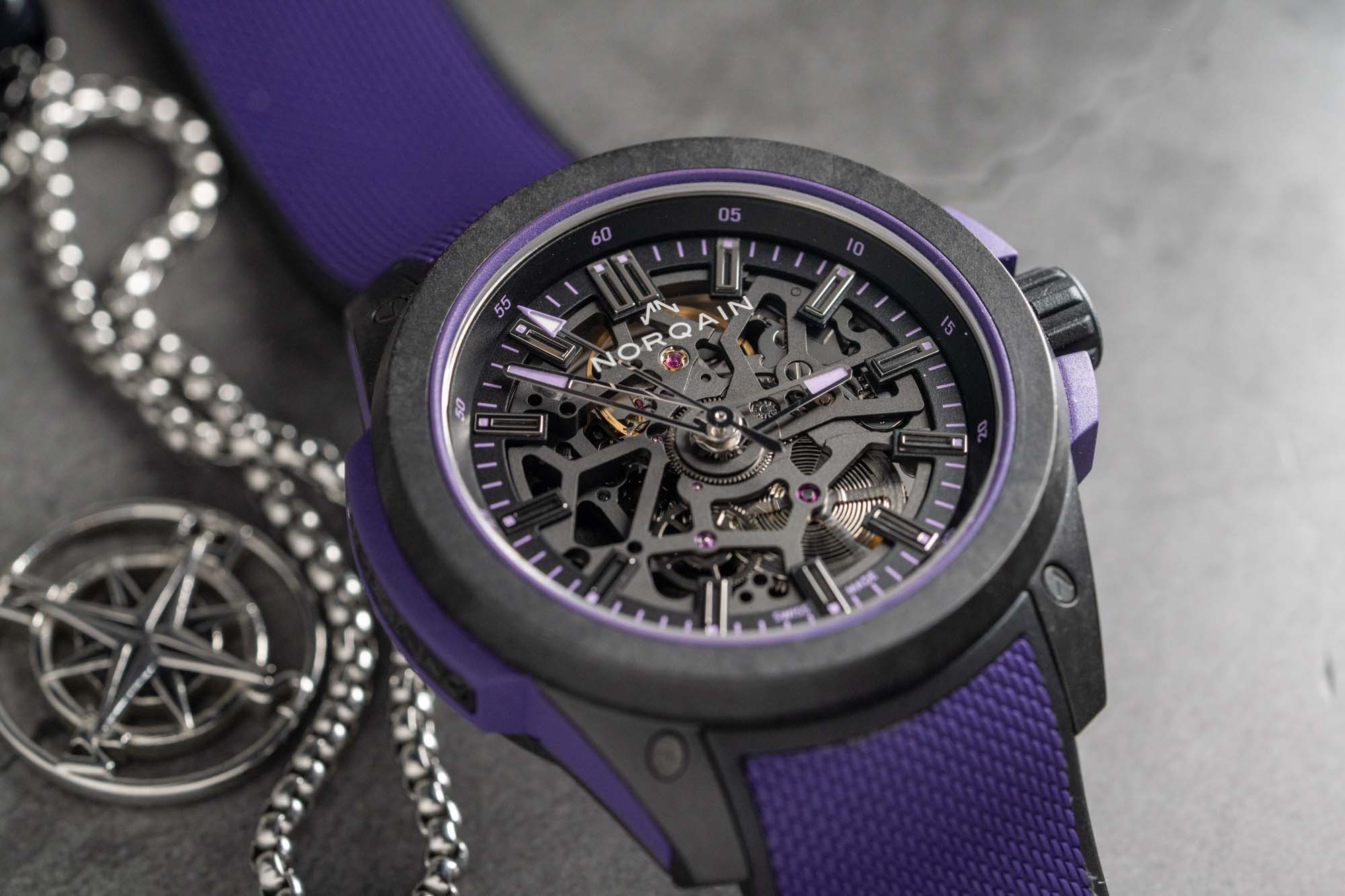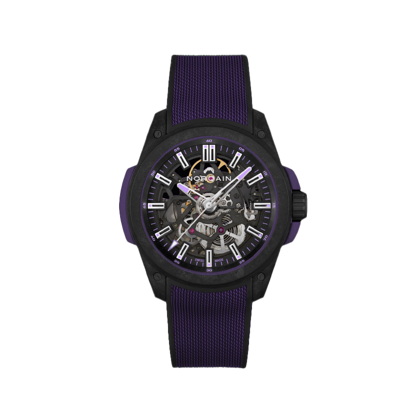 The Wild ONE Skeleton 42mm Purple marks the boldest evolution of NORQAIN’s ultimate sports watch, crafted from ultra-robust, ultra-light NORTEQ® carbon fibre, it’s six times lighter than steel and 3.5 times lighter than titanium. engineered for extremes but refined for everyday wear.